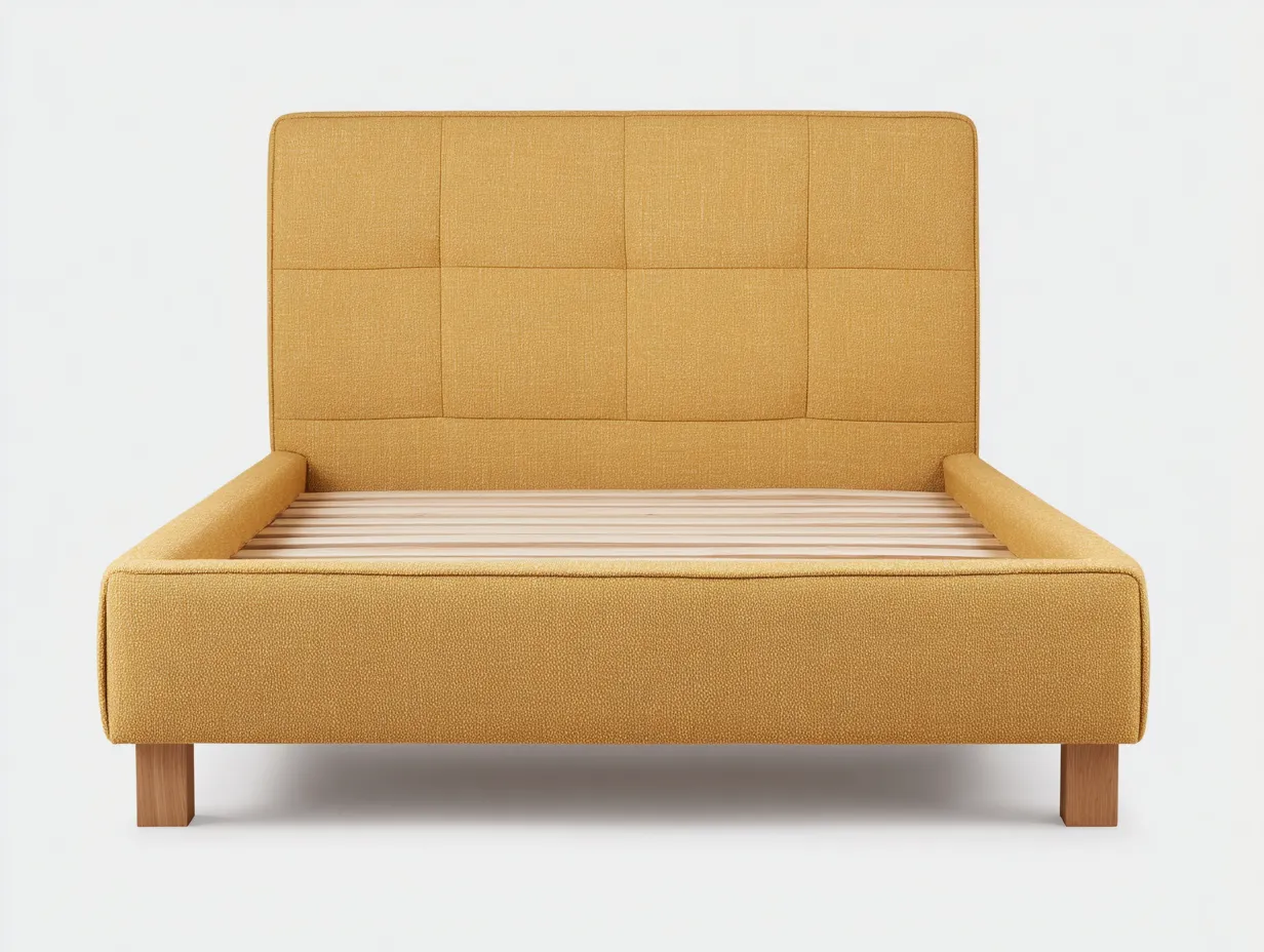 Doppelbett Polsterbett aus Boucléstoff 200 x 180 x112 cm - senfgelb - für das Schlafzimmer - modern mit gepolstertem Rasterkopfteil