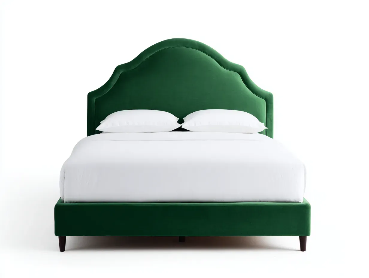 Dieses Polsterbett ist für den täglichen Einsatz im Schlafzimmer konzipiert und verbindet eine elegante Farbwirkung mit einer weich ausgearbeiteten, dekorativen Form. Die smaragdgrüne Samtoberfläche verleiht dem Möbelstück eine ruhige und hochwertige Ausstrahlung, während das hohe, geschwungene Kopfteil einen markanten Blickfang schafft. Durch die ausgewogenen Proportionen eignet sich das Modell gut für moderne, klassische oder stilvoll abgestimmte Schlafräume und bietet eine komfortable Grundlage für den täglichen Schlafbereich.