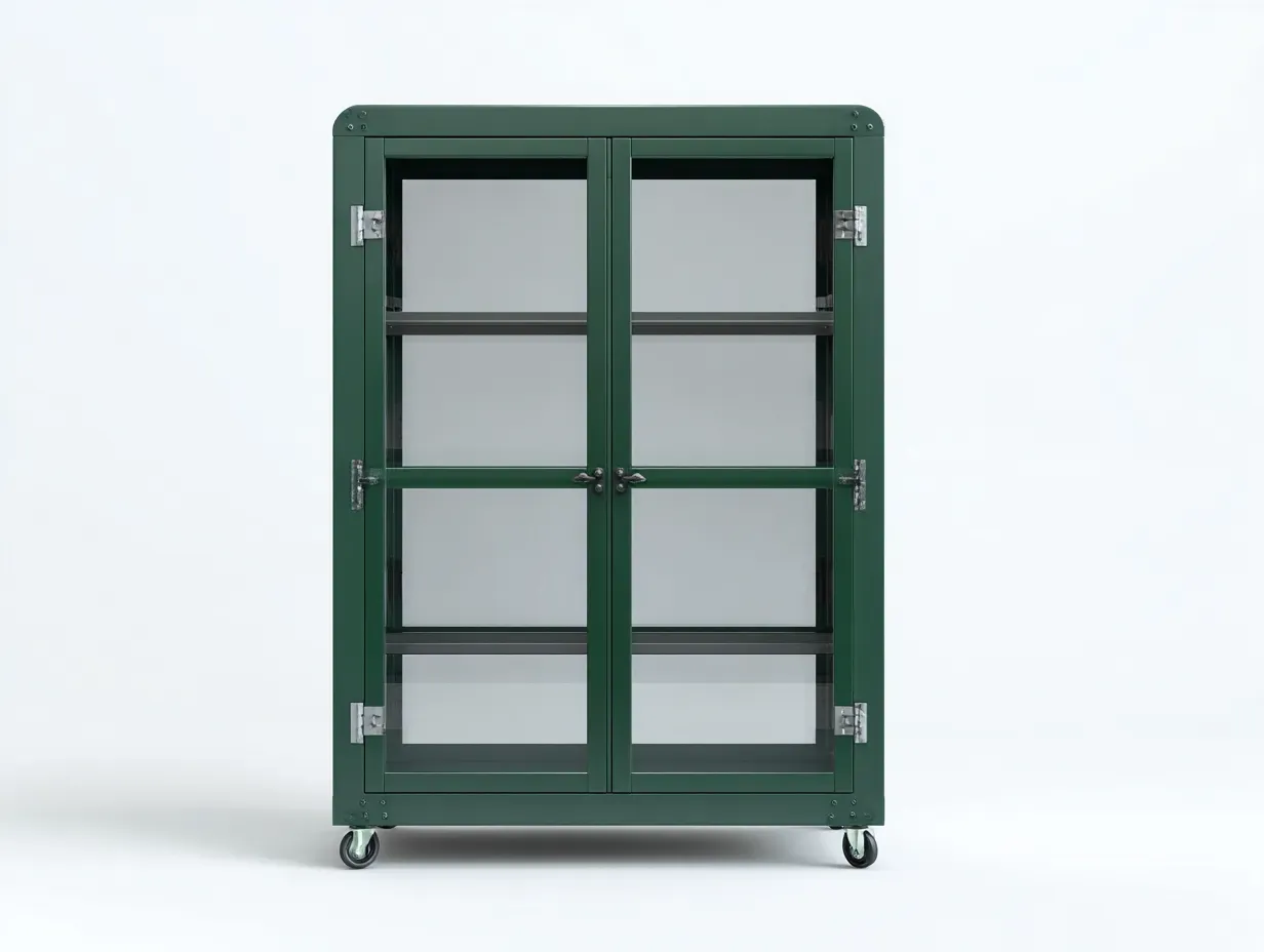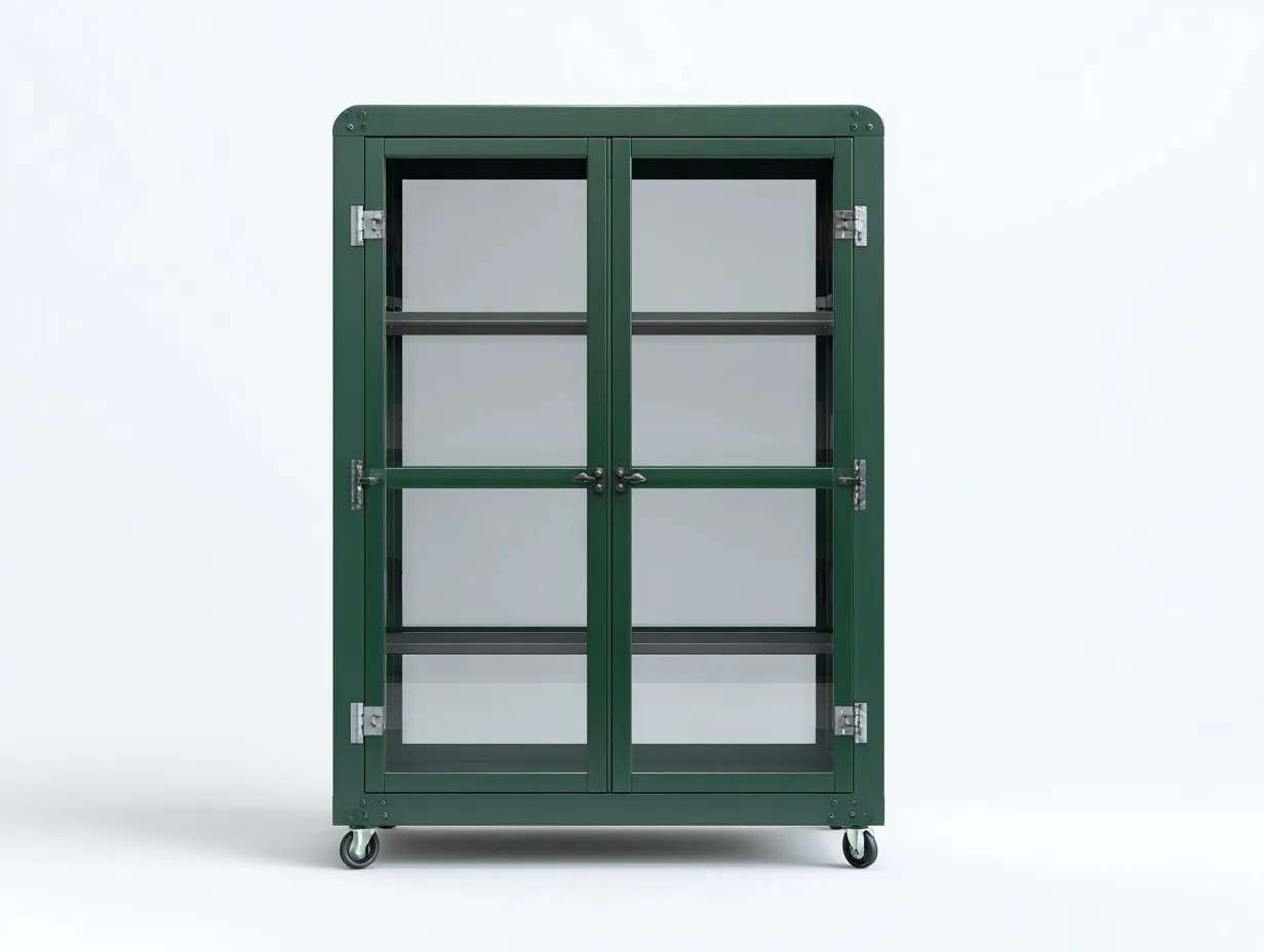 Gefertigt ist der Schrank aus robustem Metall in dunkelgrüner Ausführung mit transparenten Glaselementen in den Türen. Die Oberflächen sind auf den täglichen Einsatz im Innenbereich abgestimmt und lassen sich pflegeleicht reinigen. Die markanten Beschläge und die geradlinige Rahmenkonstruktion unterstreichen den industriell inspirierten Charakter des Möbelstücks. Gleichzeitig sorgt die klare Gliederung der Front dafür, dass der Schrank trotz seiner markanten Materialwirkung ruhig und strukturiert wirkt. Die Verarbeitung ist auf Stabilität, langlebige Nutzung und eine verlässliche Alltagstauglichkeit ausgelegt.