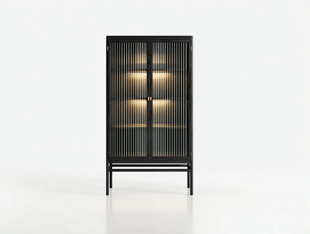 Dieser Vitrinenschrank ist für den Einsatz im Wohnzimmer konzipiert und verbindet eine schlanke, moderne Form mit dekorativer Leichtigkeit. Die schwarze Metallausführung verleiht dem Möbelstück eine klare, grafische Wirkung, während die geriffelten Glaseinsätze für eine dezente Sichtschutzfunktion und zugleich für eine elegante Tiefenwirkung sorgen. Durch das hohe Format eignet sich das Modell gut, um Bücher, Vasen, Keramik, Gläser oder ausgewählte Wohnaccessoires geordnet aufzubewahren und stilvoll zu präsentieren.